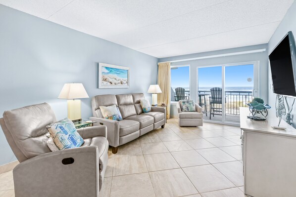 Now for a little more detail on this gorgeous condo. This tastefully furnished beach-style suite can comfortably accommodate up to two guests and includes a washer/dryer with tile floors throughout. The kitchen is modern and open to the living area with granite countertops, a glass tile backsplash, a side-by-side refrigerator, a stove, a microwave, and a dishwasher. The well-equipped kitchen includes cookware and utensils. The suite includes two cable-connected HDTVs with DVD players and access to over 100 channels. The living room area console contains a combination radio/CD player, an iPod adapter, and a new 60-inch smart TV.