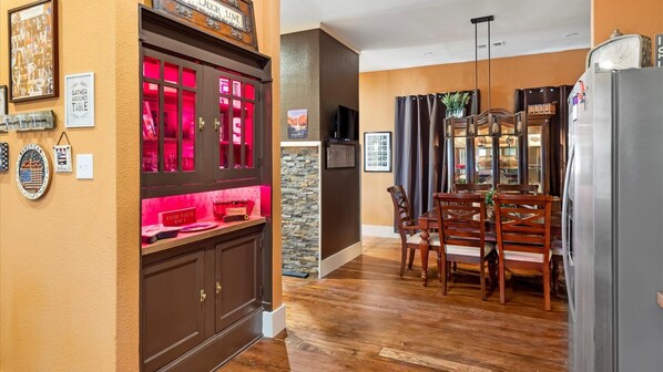 Equipped with a 60-inch smart TV with a subwoofer and surround sound in the living room, a separate dining area for up to eight people, a breakfast nook for four, a large covered front porch, and a covered back patio with a gas grill — this house is designed to make your stay truly memorable!