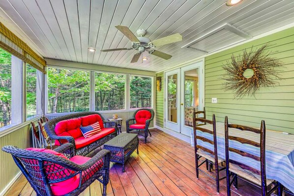 This was a cute, unusually well provisioned and updated house. It is in a peaceful pretty location close to great hiking. We hiked all day and came back to make big meals. The kitchen was very clean and well set up for cooking. Tupperware, sugar, flour, vanilla, cocoa and several spices were already there. The fridge and microwave looked brand new. There was a blender, toaster, mixer, coffee pot (made up to 4 cups-filters provided), Keurig coffee maker, and tea kettle (stove top). The gas grill worked and grilling tools were provided. Any Baking and cooking pots and pans you would need are there. We used most of it and it was new and functional. All but one of the baking pans were new ( in my experience a rarity in VRBO places). The washer and drier worked well (we had some pretty muddy clothes from hiking) and looked brand new. The furniture in the family room was comfy and perfect for hanging out. The bathroom was spotless and plenty of towels were provided. The bedrooms were fine and the master bed was comfy (we didn’t use the other bed). The deck and porch were perfect for hanging out. There weren’t any bugs when we were there but I imagine the screened in porch would be awesome for a few summer months. Overall a great place we would rent again.