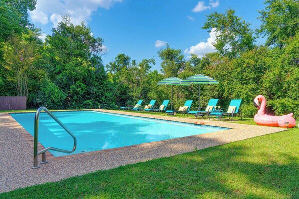 Discover "A Secret Texas Hideaway," a three-bedroom, three-bathroom retreat that offers a spacious living room, dining room, and a well-equipped kitchen. You can bask in the Texan sun by the very large swimming pool or relax in the hot tub! Enjoy outdoor activities with cornhole, a fire pit, and a BBQ pit. Managed by Heavenly Hosts