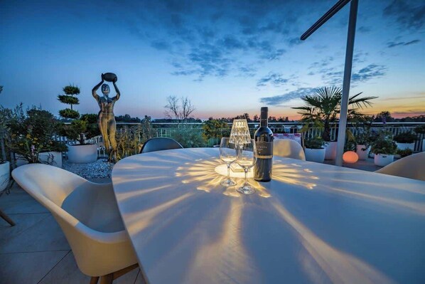 Lassen Sie den Tag auf der sehr gemütlichen Terrasse mit einem Glas Wein und dem Sonnenuntergang ausklingen oder starten Sie den kommenden Tag beim Sonnenaufgang mit einem Kaffee.