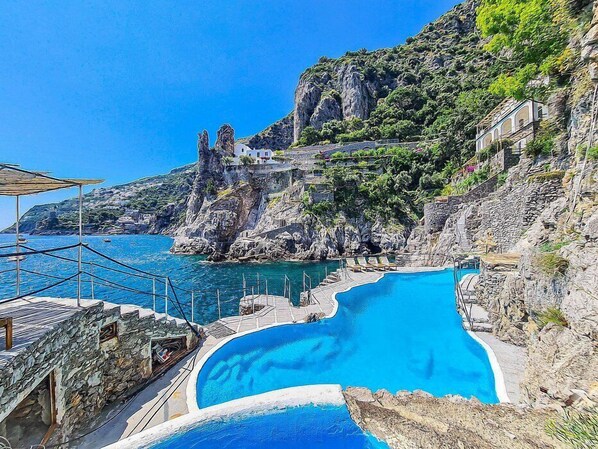You will reach the swimming pool from the third terrace going down a stairway which consists of approximately 60 steps. The pool is 7 meters (23 feet) large by 14 meters (46 feet) long. The swimming pool has a sinuous shape. It is filled with sea water. The area is equipped with sun loungers. From the swimming pool you will enjoy a thrilling view of the sea and of the small Li Galli islands at a distance. The pool is open from the beginning of May until the end of October.