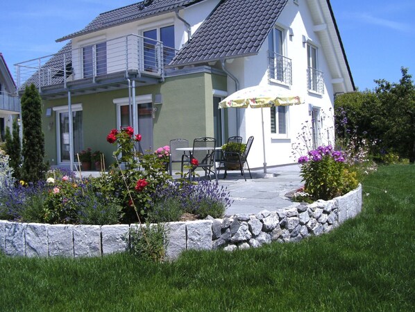 Genießen Sie den gemeinsamen Außenbereich mit einem Garten und einer offenen Terrasse.