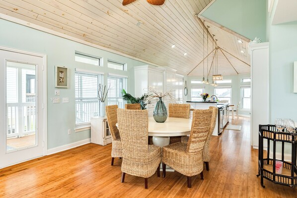 Living Room – Internet TV/two seating areas/large sectional/table seating 4; Kitchen - stainless steel appliances/granite countertops/long island with wine fridge/breakfast bar seating for 3/abundant storage; Dining area - 2 tables each seating 6; 1 Bedroom: Primary Suite (King) – TV/deck access/en suite bath/large walk-in shower/soaking tub; half bathroom; washer/dryer; uncovered deck; screened deck area