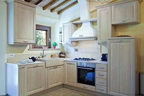 Through a private terrace you enter the living room with comfortable armchairs and fireplace, which includes a large traditional kitchen - equipped with gas stove, oven, fridge, dishwasher. The double bedroom has an en-suite bathroom. The twin bedroom’s bathroom is also accessible from the living room. Both bedrooms have large wardrobes.