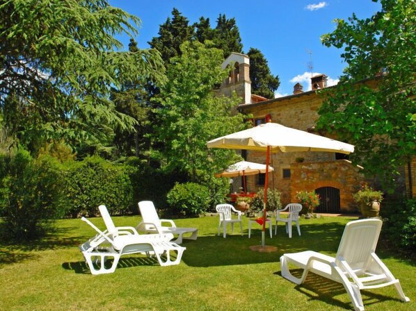 L'Antica Chiesa: Sehr schönes, historisches Zweifamilienhaus "L'Antica Chiesa", einseitig angebaut, aus dem 14. Jahrhundert, renoviert, umgeben von Bäumen, Feldern und Weinbergen. 8 km vom Zentrum von San Gimignano, alleinstehende, erhöhte Lage, im Grünen. Zur Mitbenutzung: naturbelassenes Grundstück 1 ha, Pflanzen und Bäumen. Zur Alleinbenutzung: Garten (eingezäunt) mit Rasen 1'000 m2 Blumen, Schwimmbad (9 x 5 m, 120 - 120 cm tief, saisonale Verfügbarkeit: 31.Mai. - 03.Okt.). Gartenmöbel, Grill. Im Hause: Internetzugang, Wireless LAN, Massage (extra). Heizung vor Ort zu zahlen. Wäschewechsel 1 mal wöchentlich. Koch möglich (extra). Parkplatz beim Haus auf dem Grundstück. Einkaufsgeschäft 8 km, Restaurant 2 km, Café 8 km, Bushaltestelle 5 km, Bahnstation "Poggibonsi" 20 km, Sandstrand "Cecina" 65 km. Tennis 6 km, Reitstall 8 km. Nahe gelegene Sehenswürdigkeiten: Siena 45 km, Florenz 45 km, Volterra 25 km. Bitte beachten: Die Residenz wird durch elektrische Tore geschlossen. Der Besitzer wohnt auf dem gleichen Grundstück. Der Eigentümer benutzt das Schwimmbecken nur gelegentlich.