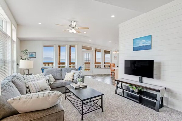 Welcome to Bluebell Views! A fabulous newer home boasting lake and golf course views from the expansive covered deck, Bluebell Views is more than ready to host the whole family for an unforgettable vacation. Being a single-level home, no one will have trouble accessing all rooms in the home, and the layout is great for entertaining with a seamless flow from the kitchen, dining area, and living room! Speaking of the kitchen, the chef of the group will be in paradise with all of the major appliances, cookware, and utensils needed to prepare favorite recipes including an outdoor grill. Don't forget to slip out of your swimsuit or golf clothes each day and take advantage of the private washer and dryer! Sleeping everyone comfortably is easy in the themed bunk rooms; and the main suite, with a luxurious soaker tub, is the perfect space for parents to find peace, quiet, and inspiration. Portable AC's for each room. Enjoy access to local beaches and boat launches, nearby state park, and pickleball courts located just down the road. We have two exterior cameras that monitor only the exterior of the property.