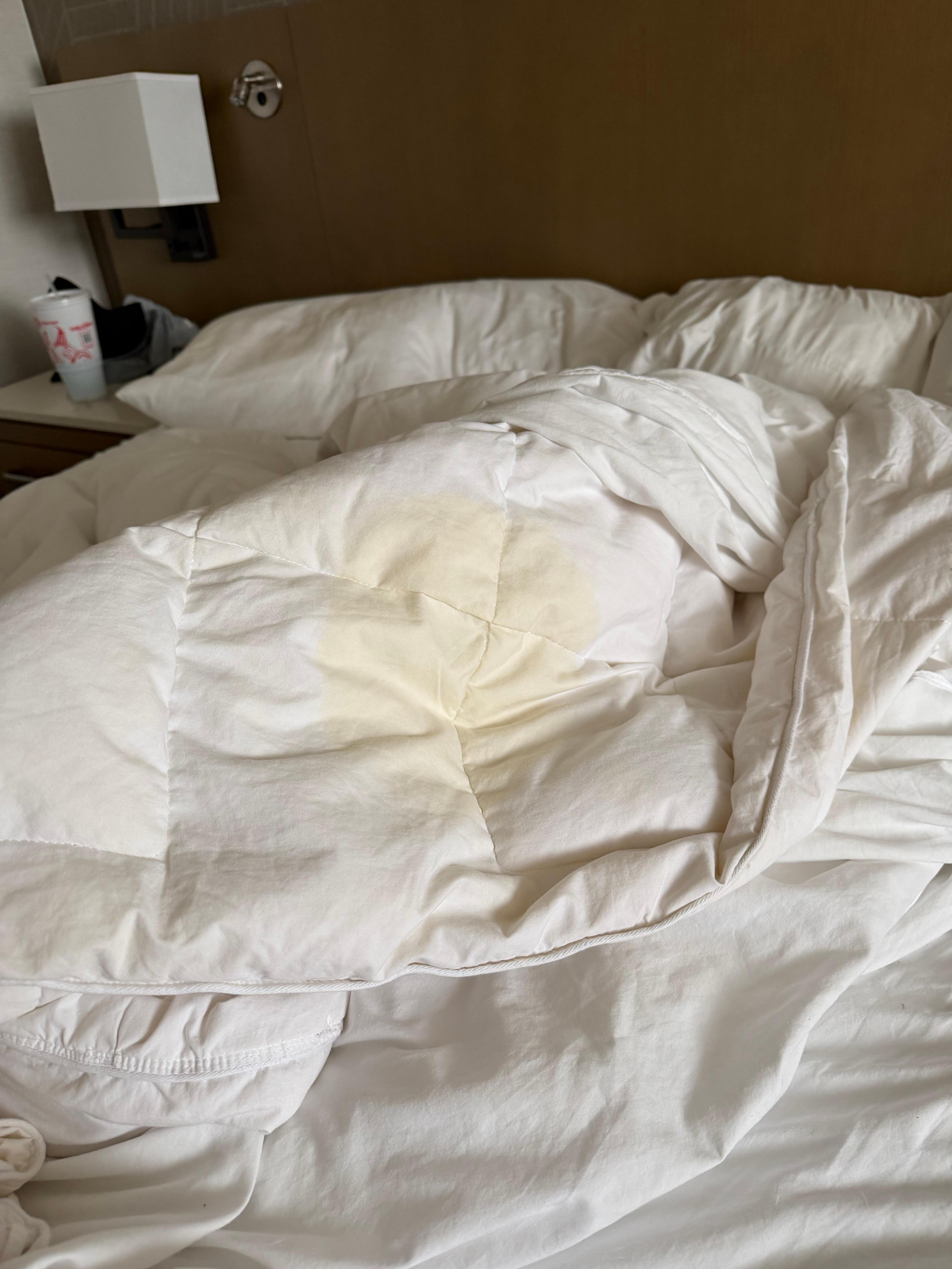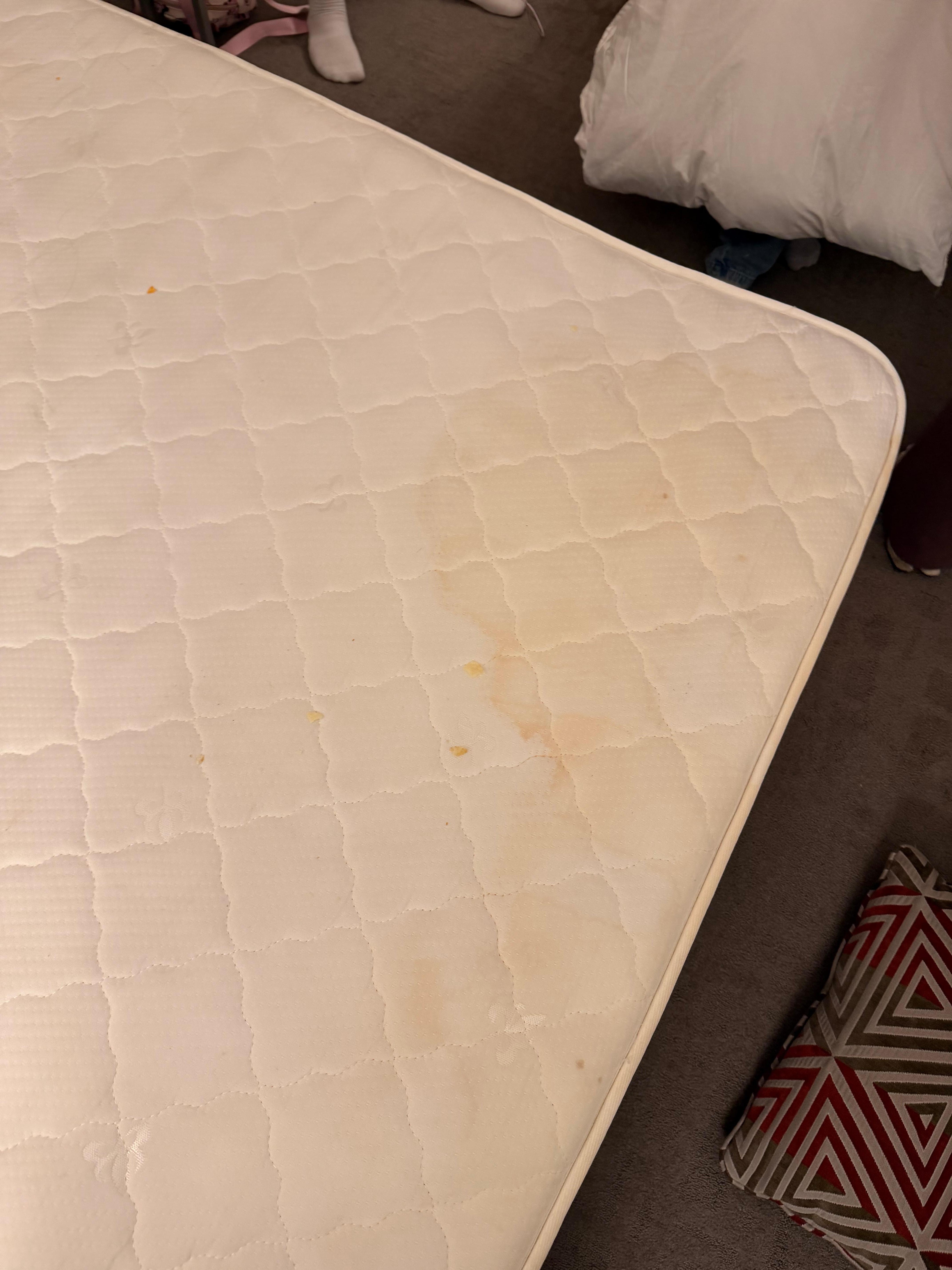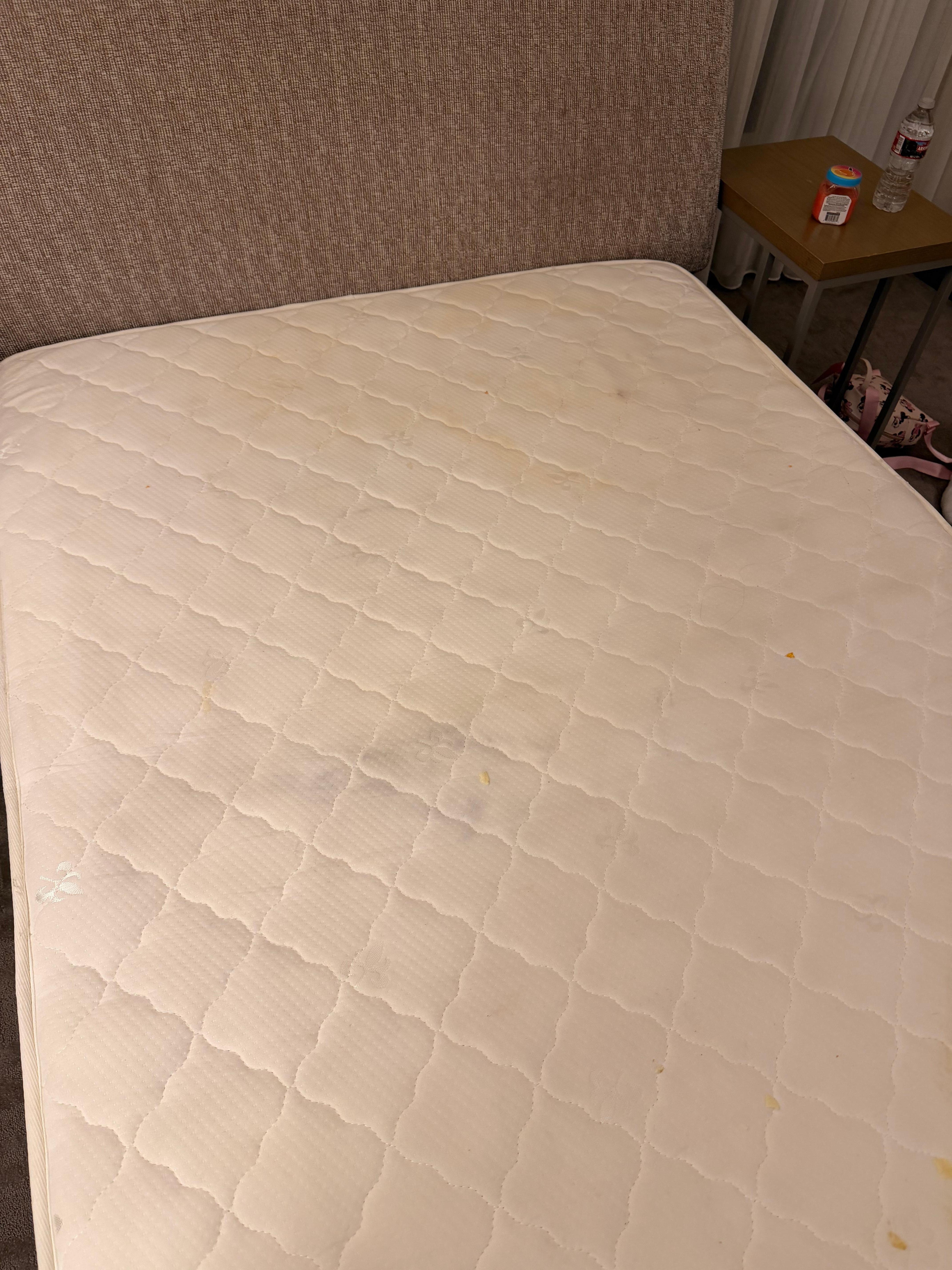 The room was in unacceptable and unsanitary condition. The mattress had multiple visible stains, the bedding had yellow stains, the carpet was dirty and heavily stained, and there was black residue coming out of the bathroom sink.