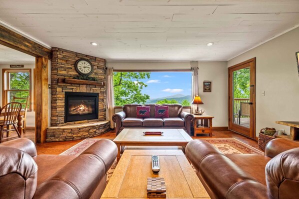 An open-concept living area features expansive windows showcasing the home's stunning Smoky Mountain view. Plush leather furnishings provide a place for guests to unwind and relax while taking in the view or watching their favorite movie (or the big game) on the large flat-screen TV. A gorgeous stacked-stone gas fireplace adds to the charm of the space.