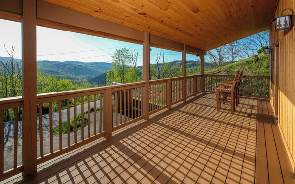 After a day of exploring, rest comfortably in one of three cozy bedrooms — each with views of the Smoky Mountains and its own TV. Two of the upstairs bedrooms feature access to a shared outdoor deck.