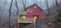 Great little property. I somehow missed that the bedrooms and bathrooms were downstairs which was only an issue because of a bum knee. The road to get to the cabin is HARROWING! Not a fault with the cabin, just was unprepared for the white knuckled driving experience. All the roads to these cabins were like that, again, not an issue with the property. Figuring out the light switches was took awhile. We loved the cabin though. Enjoyed the porch swing every morning with coffee.