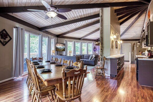 Dancing Bear Lodge boasts a warm, inviting interior with an open-concept layout on the top floor, blending rustic charm with modern comforts. The spacious living and dining areas are perfect for group gatherings, while the lower level offers additional entertainment space.