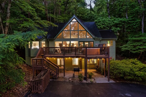 The covered patio on the lower level leads to a spacious driveway with parking for up to 5 cars, ensuring everyone in your large group has easy access to this mountain retreat.