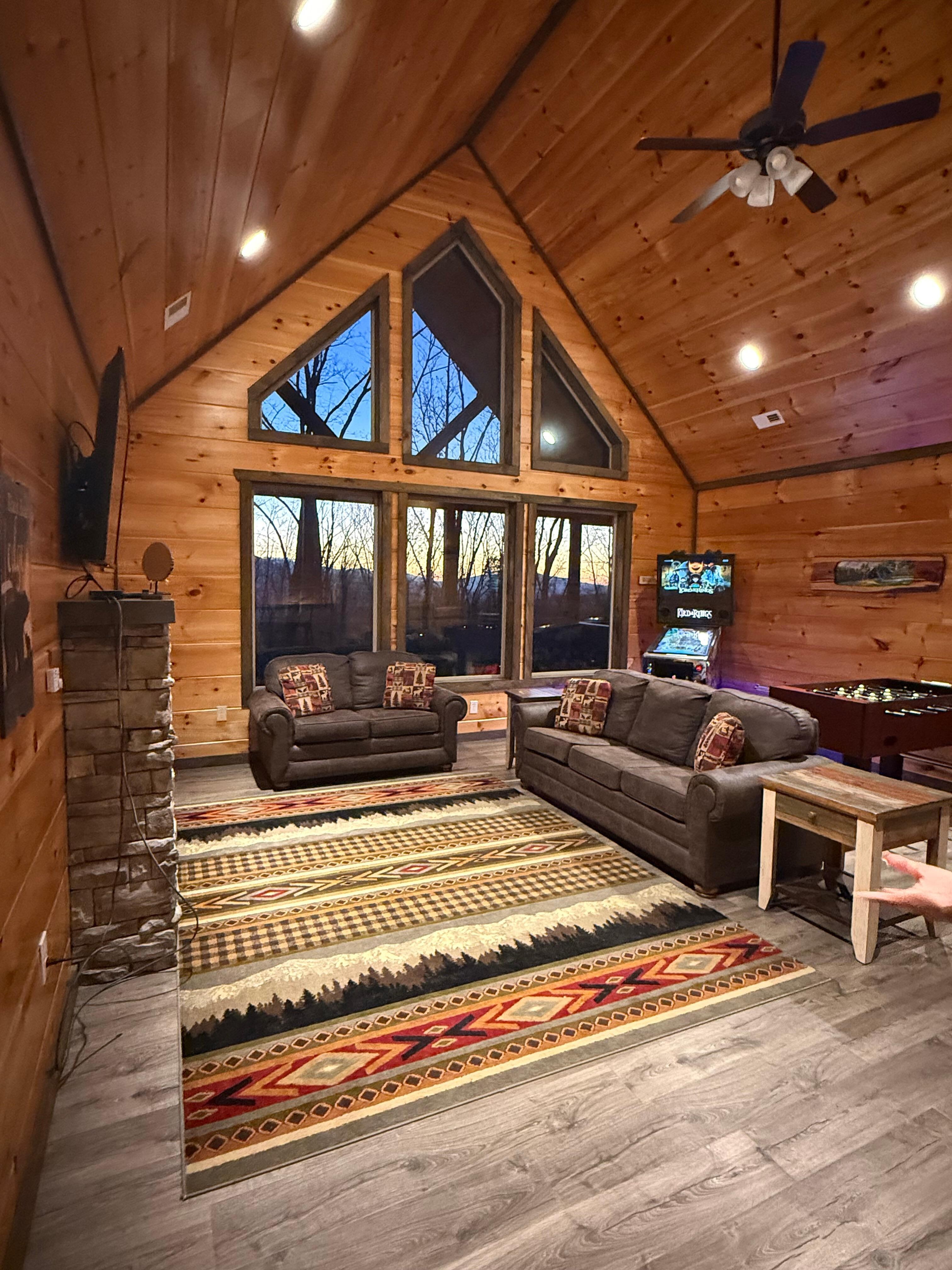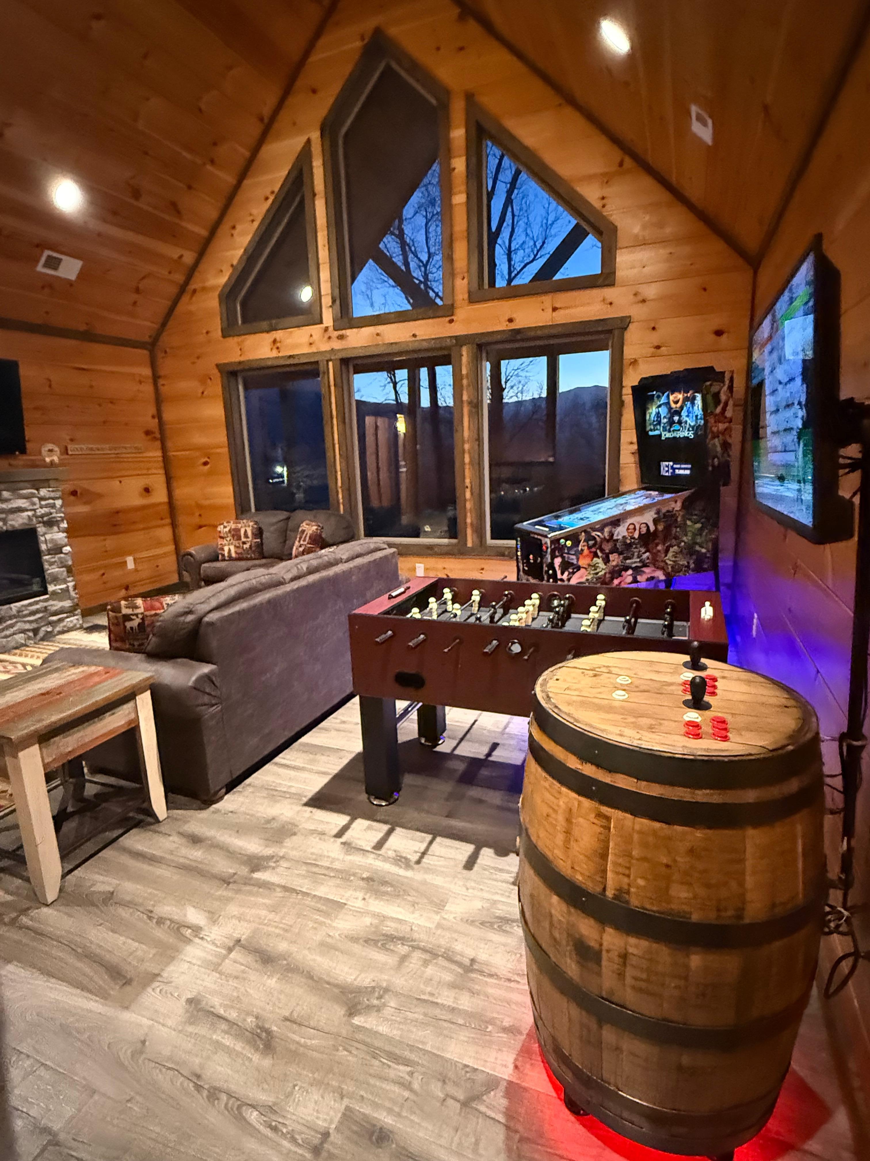 A game room on the upper level also features a second living room with a queen-size sleeper sofa, virtual pinball, a foosball table, and a multi-cade arcade game.