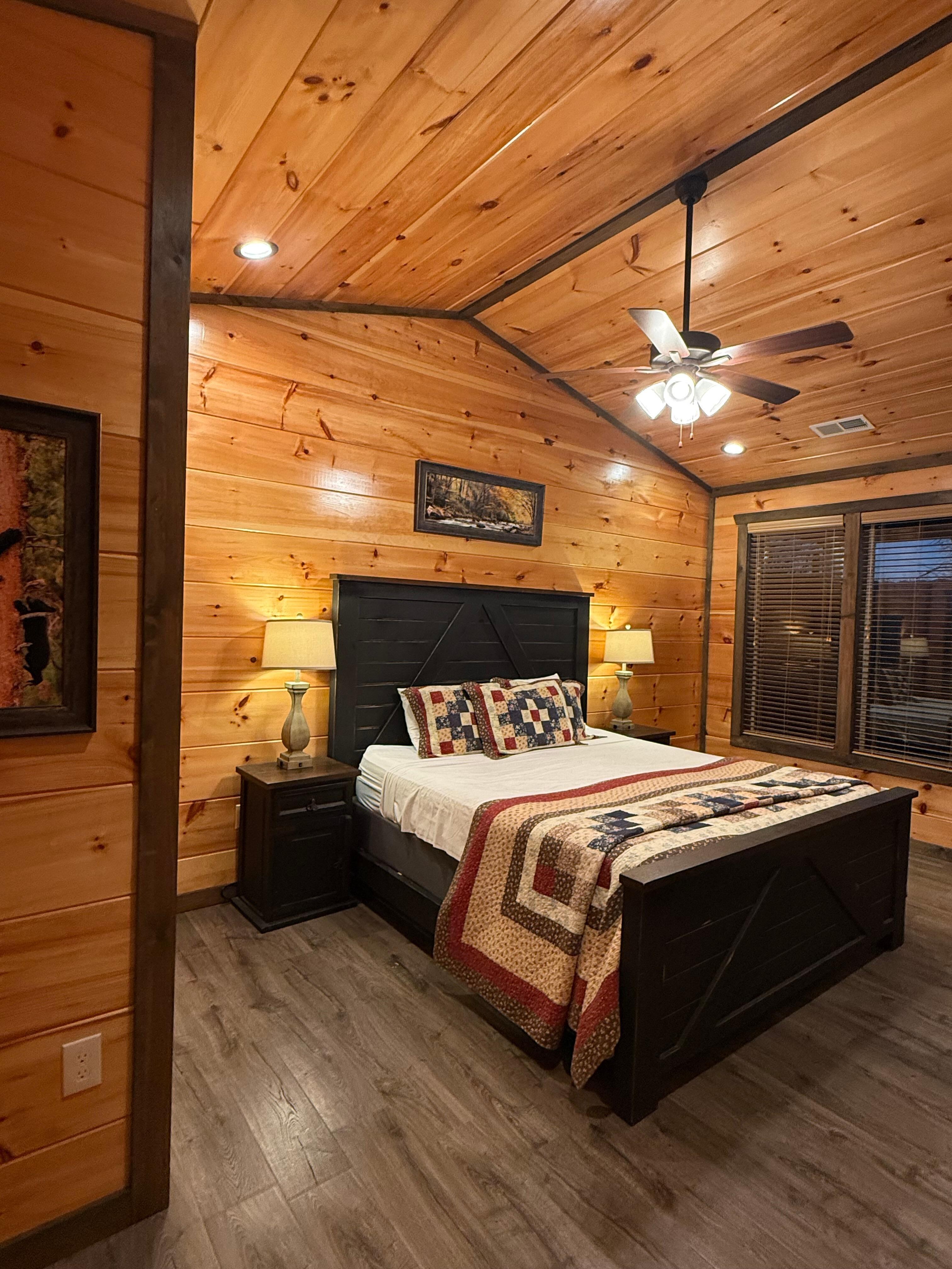 The cabin's first bedroom is on the main level and offers a relaxing king-size bed. Catch a late-night show on your 40” TV before drifting off. You’ll love having an en suite bathroom, which boasts a gorgeous tiled stand-up shower.