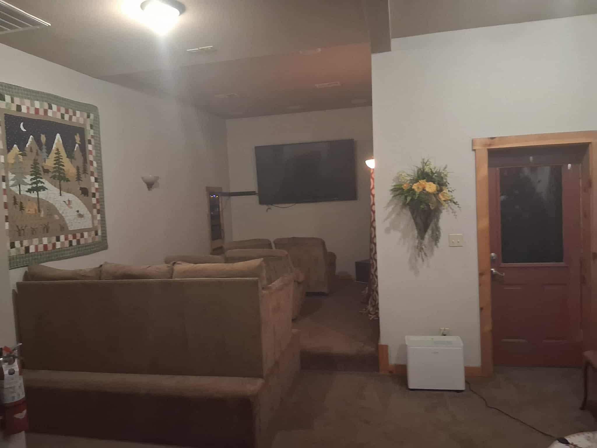 Die untere Ebene ist das Theater. Dieses 10 x 40 cm große Zimmer verfügt über einen 80-Zoll-Smart-TV und einen Blue-Ray-DVD-Player. Für Ihren Sehkomfort haben wir Liegen bereitgestellt. Es gibt auch eine Bartresen mit Mikrowelle und Badezimmer auf dieser Etage. Auf dieser Ebene befindet sich ein Einzelblockbett für 1 Person. Es gibt zwei Ausgangstüren vom Theater zum Balkon.