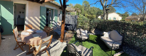 Mazet plein de charme dans une résidence à taille humaine, vous avez envie de tranquillité, envie de découvrir le Gard ? C est le point de chute idéal : 18km d Uzès, 15km du pont du Gard, de belles balades en perspective !!! Envie de farniente? Notre piscine et le restaurant vous attendent !!! Pour le côté pratique, le supermarché est en bas du village, à moins de 2 km, vous trouverez la pharmacie et tous les commerces dont vous avez besoin . pour la journée mer : Grau-du-Roi est à 1h .