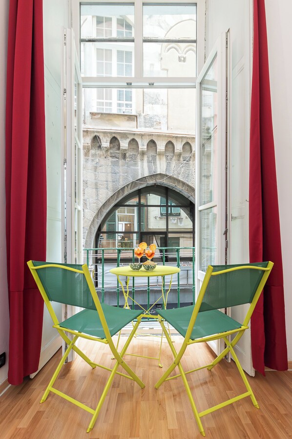 The romantic view of Via dei Giustiniani and the cosy sitting area, with its small table and two chairs, will provide you with moments of peace and relaxation.