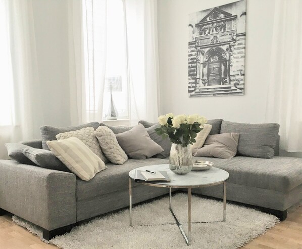 Das EG Appartement besticht durch sein großes, lichtdurchflutetes Wohnzimmer – selbstverständlich ausgestattet mit einem Flachbildschirm-Fernseher, nebst Chromecast, um Ihre Urlaubsbilder zu bewundern.