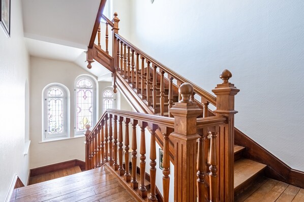 - An oak staircase with superb beech spindle banister and stained glass windows on the first landing.