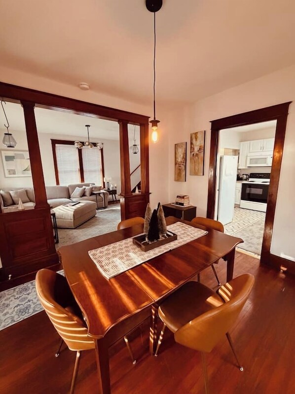 The dining area sits between the living room and kitchen, creating an easy flow for shared meals, board games, or planning the next day’s sightseeing adventures.