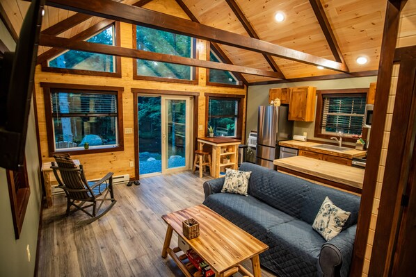 The cabin is set up for 2 guests very comfortable, however if your kids or other friends do not mind sleeping on the very comfortable queen sleeper sofa located in living room that is a great option for a total of 4 guests.