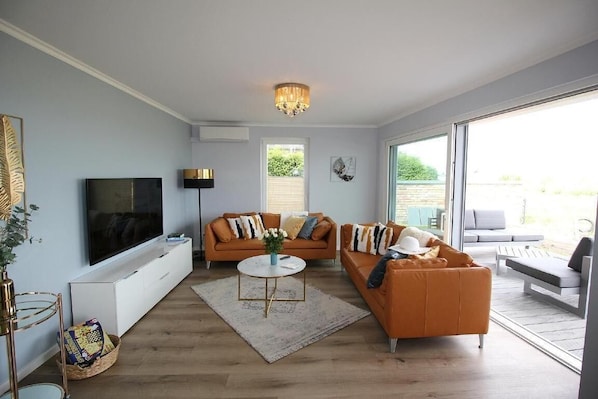Direkt am feinsandigen Sandstrand von Glowe wohnen Sie komfortabel in einem exclusiven Ferienapartement mit freiem Blick direkt auf die Ostsee.Die „Villa am Meer“ direkt am Strand mit Ostseeblick steht ab sofort für unsere Gäste bereit. Das Ferienapartement verfügt auf ca. 100m² über einen gemütlichen Wohnraum mit integrierter Küche, 2 Schlafräumen mit Doppelbett, sowie 2 Bädern mit Dusche und einer Sauna.Die Terrasse, ausgestattet mit Loungemöbeln, ist aus dem Wohnbereich begehbar.Eine Ausstattung die Sie nichts vermissen lässt, wie z.B.: 2 Pkw Stellplätze, hiervon ist einer mit einer E-Ladestation ausgestattet, ein Waschtrockner, TV in allen Zimmern, Klimaanlage, Aktive Hauslüftung, Innen- und Außenfensterbeschattung mit elektrischen Jalousien, eine Hochwertige moderne Küche, sowie eine Sauna tragen zu einem unvergesslichen Urlaub bei. Das Wichtigste aber ist der Ostseeblick und der kurze Weg von ca. 50 Metern bis zum breiten, feinsandigen Ostseestrand.Entdecken Sie Glowe zum shoppen und flanieren in Boutiquen und Einkaufsläden, Restaurants und Cafe´s, nutzen Sie die zentrale Lage im Ort zum spazieren auf der nahe gelegenen Promenade.Statt mit dem Auto können Sie ebenso die Umgebung mit dem Rad, Montainbike oder Inlineskates erobern.Der bewaldete Küstenstreifen lädt ab August/ September zum Pilze suchen ein.Quelle Wikipedia:Rügen ist die größte und bevölkerungsreichste Insel Deutschlands. Sie liegt vor der Ostseeküste Vorpommerns und gehört zum Landkreis Vorpommern-Rügen im Land Mecklenburg-Vorpommern.Die Insel hat eine Fläche von 926 km², eine maximale Länge von 52 km (von Süd nach Nord) und eine maximale Breite von 41 km im Süden. Eiszeitlich bedingt ist Rügen sehr hügel- und wasserreich. Die Küste ist durch zahlreiche Meeresbuchten und Lagunen (Bodden und Wieke) sowie vorspringende Halbinseln und Landspitzen stark gegliedert. Im Juni 2011 verlieh die UNESCO dem für seinen gewaltigen Buchenbestand und die weißen Kreidefelsen bekannten Nationalpark Jasmund auf Rügen den Status des Weltnaturerbes.[1]Auf Rügen liegen der zentrale Hauptort Bergen, die Hafenstadt Sassnitz, die Fürstenresidenz Putbus, die Landstadt Garz und die Ostseebäder Binz, Sellin, Göhren, Baabe, Thiessow, Breege und Altefähr. Rügen ist vor allem dank seiner vielfältigen Landschaft und Natur, der Reet- und Bäderarchitektur mit vielen Baudenkmalen, dem wachsenden Gast- und Kulturangebot sowie der langen, feinsandigen Badestrände ein beliebtes Urlaubsziel. Die Insel verzeichnete 2014 gut sechs Millionen Übernachtungen.[2]Der lateinische und historische Name der Insel Rügen ist Rugia. Das Adjektiv für auf die Insel bezogenes ist rügisch, auch rüganisch bzw. Rügener. Die Inselbewohner werden Rügener oder Rüganer genannt.Das „Tor“ zur Insel Rügen ist Stralsund, durch Rügendamm und Rügenbrücke über den zwei Kilometer breiten Strelasund ist Rügen mit dem Festland verbunden."Villa Glowe" Ferienapartement EG -Direkt am feinsandigen Sandstrand von Glowe wohnen Sie komfortabel in einem exclusiven Ferienapartement mit freiem Blick direkt auf die Ostsee.