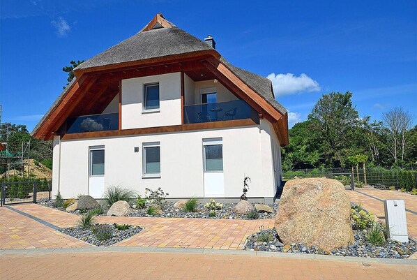Erdgeschoss: modern und elegant eingerichteter Wohnbereich mit gemütlicher Couchlandschaft und Sessel, der Kamin spendet Wohlfühlatmosphäre an kalten Tagen, TV Sat/Kabel (Flatscreen), Radio, komplett ausgestattete hochwertige Einbauküche mit Kochinsel, großer Esstisch für 6 Personen, 4-Plattenherd (Induktionsherd), Backofen, Kühlschrank mit einem kleinem Gefrierfach, Geschirrspüler, Mikrowelle und diversen Elektrogeräten, 1. Schlafzimmer mit einem Einzelbett (100 x 200) mit Kleiderschrank und Schreibtisch, 1. großes Bad mit ebenerdiger Dusche, Badewanne, WC und Föhn Obergeschoss: 2. Schlafzimmer mit Zugang zum Balkon, Doppelbett (zwei getrennte Matratzen je 80 x 200) und Kleiderschrank mit Schreibtisch, 3. Schlafzimmer mit Zugang zum Balkon, Doppelbett (zwei getrennte Matratzen je 80 x 200), ein Einzelbett (90 x 200 ) und Kleiderschrank mit Schreibtisch, 2. Badezimmer mit ebenerdiger Dusche, WC und Föhn, Souterrain: Waschmaschine, Bügelbrett und Bügeleisen, Wäscheständer Außenbereich: gepflegtes Grundstück, Terrasse mit bequemen Gartenmöbeln (6 Gartenstühle), Grillmöglichkeit besteht (Grill vorhanden), Fahrradständer Zeit für Erholung! – Genießen Sie traumhafte Urlaubstage – Erstvermietung seit dem 01.08.2020 Das schöne neuerbaute Reetgedeckte Doppelhaus „Kliffrand“ ist modern und mit viel Liebe zum Detail eingerichtet. Das gepflegte Grundstück mit Liegewiese ist komplett umzäunt und lädt zum Entspannen ein. Internet (WLAN) steht Ihnen kostenfrei zur Verfügung. Wohnzimmer, Küche und die Bäder haben Fußbodenheizung. Alle anderen Räume haben Heizkörper. Die Fenster sind mit elektrischen Außenjalousien und teilweise mit Insektenschutz ausgestattet. Das Ferienhaus „Kliffrand“ ist ein Nichtraucherquartier. Am Objekt befinden sich 2 PKW-Stellplätze und eine Abstellmöglichkeiten für Fahrräder. Haustiere sind nicht erwünscht.