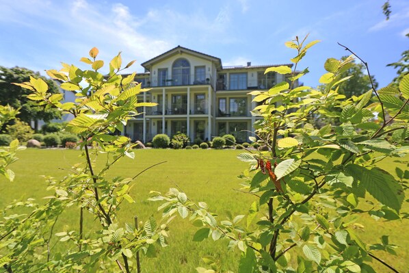 Göhren ist außergewöhnlich: Göhren hat Weitblick, denn es liegt auf einer Anhöhe inmitten eines Naturreservats mit Buchenwäldern am Hochufer, langen weißen Sandstränden, schroffen Steilküsten und der malerischen weiten Landschaft der Halbinsel Mönchgut. Diesen Weitblick fangen die Lage und die Architektur der Villa Pauline auf. Die Villa umfasst 9 Wohnungen auf einem ca. 2000 m² großen Grundstück mit einem exklusiven Garten. Sie liegt in einer exponierten und ruhigen Hochuferlage, als letztes Haus einer Stichstraße. Die Wohnung 5 im Obergeschoss ist über den Fahrstuhl erreichbar. Sie verfügt in allen Zimmern und Bädern über große bodentiefe Fenster. Licht und Weite werden eingefangen. Von dem großen Nord-West- Balkon und vielen Zimmern blicken Sie direkt auf den Garten und den dahinterliegenden Buchenwald, der im Herbst bunt leuchtet. Im Winter und Frühjahr (mit Glück auch in der übrigen Zeit) ist der Blick frei auf das Meer: Sie hören es rauschen. Der kleinere Süd-West-Balkon lädt zum Sonnen ein. Zum feinen flach abfallenden kilometerlangen Sandstrand gelangen Sie in wenigen Minuten und bei Bedarf ganz bequem über einen gläsernen Fahrstuhl. Die Ortsmitte mit Supermarkt, Sparkasse, Bäcker, kleinen Boutiquen und Restaurants ist in wenigen Metern fußläufig zu erreichen. Wanderwege und Radwege schließen an das Villengrundstück an. Fernbus- und Kleinbahn enden unterhalb des Hochuferwaldes.