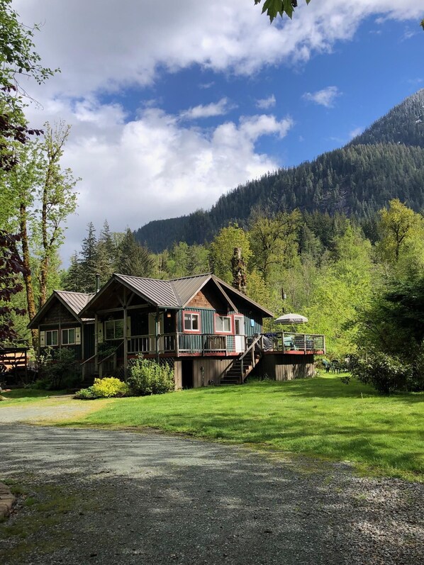 AUSSENBEREICH: Geräumige, umzäunte Terrasse mit Propangrill, Whirlpool mit einer unglaublichen Aussicht auf den Mt. Index. Die gemeinschaftliche Zufahrt zum Fluss liegt direkt auf der anderen Straßenseite. Wir verwalten mehrere andere Mietobjekte in Gehweite, wenn Sie mehr Familie und Freunde mitbringen möchten!