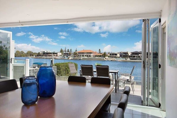 Step out through bi-fold doors to the main dining and entertaining area. This is where you'll have the most fun with family and friends, perhaps over drinks, games and dinner. Take a cooling dip in your own private infinity pool (unheated) and watch the world go by on the river. Keen fishing enthusiasts can cast a line into the river from the pontoon and cook their catch on the BBQ. Please note, the pontoon is for fishing only and can not be used for guest's own boats or jet skis due to damage caused by previous guests restricting ongoing use.