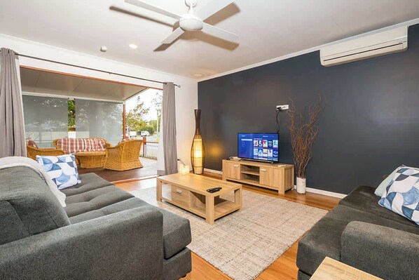 Comfy living room with a smart TV and ample seating, 3.5 bedrooms, open kitchen and dining, and a spacious patio surrounded by salty breezes. Cook up a storm in the fully equipped Kitchen, or sit beneath the stars. Grab a coffee from the local cafe and enjoy it on your garden view patio before strolling down to the crystal clear waters of Tally creek. Rinse the salty water off in your warm shower and head to one of the spacious bedrooms. Perfect for 2 families.