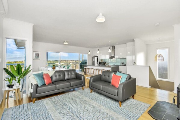The kitchen is sleek and fully equipped for easy entertaining, featuring stone benchtops, quality appliances, and generous space to cook and gather. The adjoining dining area invites long, relaxed meals, while the living zone is warmed by soft light, inviting seating, and a slow-combustion fireplace that sets the tone for cosy evenings and movie marathons.