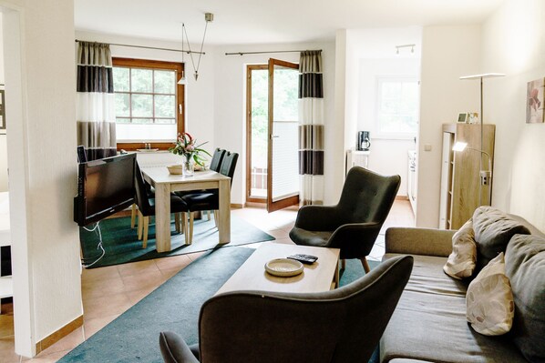 Alle Gästezimmer im "Erleben Sie Luxus und Gemütlichkeit in der Bocksbergblick Ferienwohnung!" verfügen über Komforts wie kostenloses WLAN und Esstische.