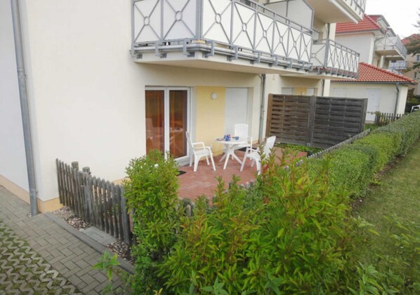 Zu der Ferienwohnung gehören ein Abstellraum und eine umzäunte Terrasse mit Gartenmöbeln.