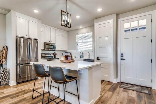The eat-in kitchen is equipped with top-of-the-line appliances and a center island, offering ample space for cooking and dining. You can also choose to eat dinner al fresco at the community poolside cooking pavillion featuring outdoor seating, gas grills, and an outdoor TV. If you don't feel like cooking, Hemmingway's and the Pie House are just a 5 minute walk away for dine in or carry out.