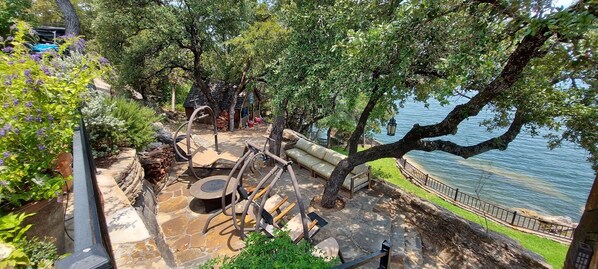 Numerous outdoor seating areas and decks, ensure you can always find a spot in the shade or the sun at any time of the day. Relax in the floating swings as the kids play in the wooden playhouse. A 2 story dock features large lounging chairs on the top level and an area for jumping into the lake. The lower level has an area to tie up a boat on the side of the dock and seating area for 6. The owners boat stays in the slip on a lift. The small cove behind the dock is great for swimming and floating as it is protected from the open water of the lake.