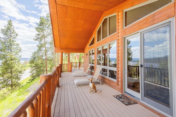 On the covered deck you will find an 8 person hot tub ready for you to soak up the unobstructed views of Shadow Mountain Lake.