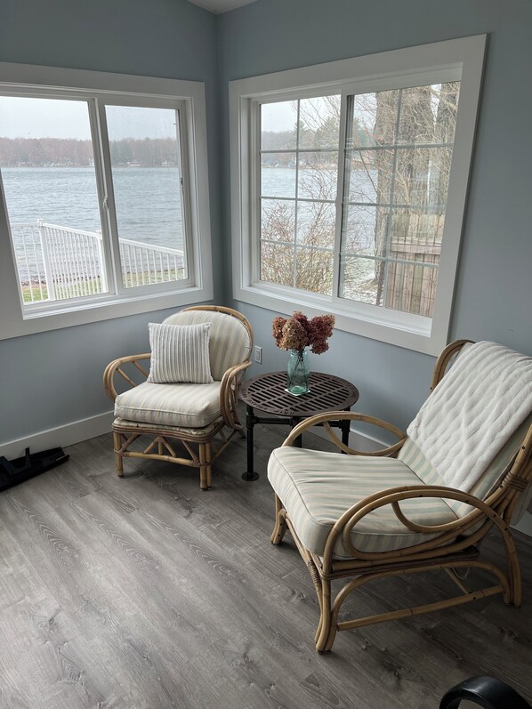 Lake is visable from every room except the bedroom and bathroom.