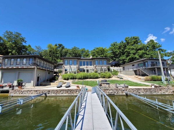 The modern, luxury, lakefront home and the private dock are fully equipped for you and your guests to enjoy your Lake of the Ozarks vacation. Your private oasis offers a Main House, guest house (Casita) and large private dock. Your luxurious main lake house features three bedrooms, and a study with a convertible sofa bed and offers two and a half bathrooms. The Main house bedrooms include 1 king bed (master bedroom on the lower level), 1 queen bed, a second queen bed and a convertible sofa bed (study) on the main level. The lower level, master bedroom features an ensuite bathroom, custom shower and separate, jetted bathtub. It also features a large walk-in closet. All of the bedrooms include spacious closets, flat screen televisions, and chic décor.