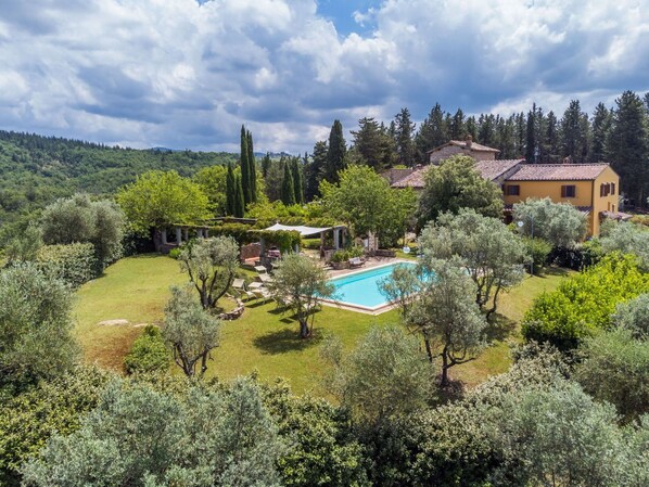 Gemütlich auf Weingut "Reggine", aus dem 18. Jahrhundert, renoviert, umgeben von Wiesen und Feldern. 3 km vom Zentrum von Panzano, 10 km vom Zentrum von Greve in Chianti, 40 km vom Zentrum von Firenze, alleinstehende, erhöhte Lage, im Grünen. Zur Mitbenutzung: Grundstück mit Rasen, Obstgarten, Schwimmbad (12 x 6 m, saisonale Verfügbarkeit: 01.Mai. - 15.Okt.). Aussendusche, Pergola, Terrasse, Gartenmöbel, Grill, Poolpflege durch den Besitzer/Gärtner. Zufahrt (2.4 km Naturweg). Parkplatz auf dem Grundstück. Einkaufsgeschäft 3 km, Lebensmittelgeschäft 3 km, Supermarkt 10 km, Restaurant 3 km, Bäckerei 3 km, Bushaltestelle 3 km, Hallenbad 21 km. Golfplatz (18 Loch) 25 km. Nahe gelegene Sehenswürdigkeiten: Radda in Chianti 15 km, Siena 40 km, San Gimignano 40 km. Bitte beachten: Fahrzeug empfohlen. Babyausstattung (inkl.). Jugendgruppen nur auf Anfrage. Ab Hof Verkauf von bäuerlichen Produkten. Besitzer nutzt Räume im Haus. Alle Häuser/Wohnungen sind individuell eingerichtet.