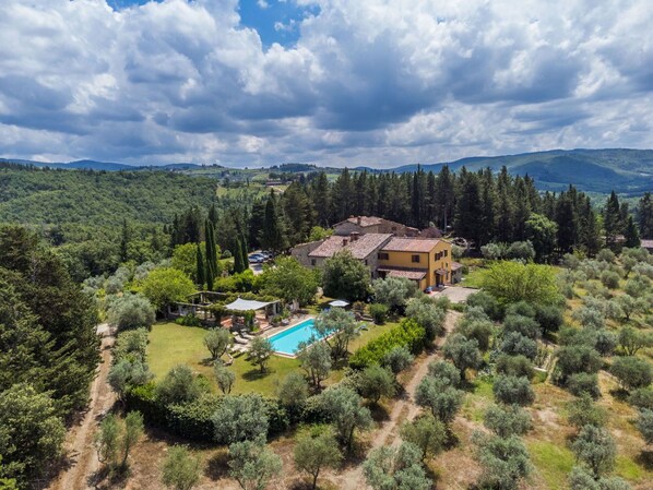 Gemütlich auf Weingut "Reggine", aus dem 18. Jahrhundert, renoviert, umgeben von Wiesen und Feldern. 3 km vom Zentrum von Panzano, 10 km vom Zentrum von Greve in Chianti, 40 km vom Zentrum von Firenze, alleinstehende, erhöhte Lage, im Grünen. Zur Mitbenutzung: Grundstück mit Rasen, Obstgarten, Schwimmbad (12 x 6 m, saisonale Verfügbarkeit: 01.Mai. - 15.Okt.). Aussendusche, Pergola, Terrasse, Gartenmöbel, Grill, Poolpflege durch den Besitzer/Gärtner. Zufahrt (2.4 km Naturweg). Parkplatz auf dem Grundstück. Einkaufsgeschäft 3 km, Lebensmittelgeschäft 3 km, Supermarkt 10 km, Restaurant 3 km, Bäckerei 3 km, Bushaltestelle 3 km, Hallenbad 21 km. Golfplatz (18 Loch) 25 km. Nahe gelegene Sehenswürdigkeiten: Radda in Chianti 15 km, Siena 40 km, San Gimignano 40 km. Bitte beachten: Fahrzeug empfohlen. Babyausstattung (inkl.). Jugendgruppen nur auf Anfrage. Ab Hof Verkauf von bäuerlichen Produkten. Besitzer nutzt Räume im Haus. Alle Häuser/Wohnungen sind individuell eingerichtet.