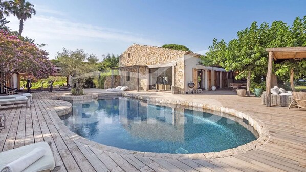 Draußen ein großer beheizter Pool, ein Poolhaus, eine Sommerlounge für 10 Personen in Ruhe mit Blick auf den Pool. Ein ausgestattetes Fitnessstudio im Freien mit Blick auf den Pool. Ein Boulodrome, ein Mini-Fußballplatz für Kinder, Tischtennis. Ein üppiger und bewaldeter Garten. Ein kleines Paradies in der Nähe der Strände und von Saint-Tropez.