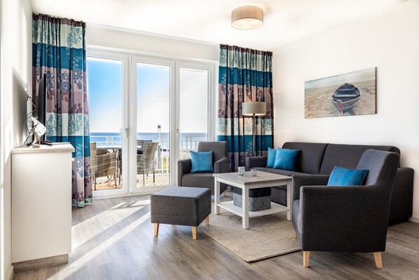 Sonnige Stunden mit Panoramablick auf die See verbringt ihr auf dem großzügigen 10 qm großen Balkon in Süd-Ost-Lage. Der Balkon ist mit Gartenmöbeln ausgestattet und sowohl vom Wohnbereich als auch von einem der Schlafzimmer aus begehbar.