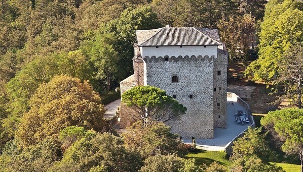 Castello dei Principi is a charming six-story castle surrounded by the greenery. It sleeps 30 people. From Castello dei Principi you will enjoy a charming view of the forest that surrounds the estate. Castello dei Principi is 800 square meters (8610 square feet). It features a private swimming pool, two private terraces, a private patio, a private garden, air conditioning (please read description below to check in which rooms the units are installed), winter heating and WI-FI Internet access. You will be roughly 17 km (10.5 miles) from Gubbio, where you will find restaurants, shops and public transportation. You will find the closest restaurant and a grocery store at 3.5 km (roughly 2.2 miles). You will reach Castello dei Principi from the parking area without having to climb any steps. To stay at Castello dei Principi you will need a car. You will be able to park it free of charge on the premises. Please note that access to Castello dei Principi is along a 2-kilometer (1.2 mile) unpaved road. Please kindly note. The rental price includes: final cleaning; linens, changed mid-week; towels, changed mid-week; maid service five days a week 4 hours each day; beach/pool towels; electricity.Available upon request: pets; baby bed. Available for a fee, if desired:heating (when needed) EUR 350.00/day;continental breakfast;chef/cook. Tourist tax, paid locally: EUR 2.00 per person per night for the first 5 nights. Guests aged under 12 are exempt. Refundable security deposit paid cash upon arrival: EUR 500 (it is returned to you at check-out). Swimming Pool The swimming pool is 7 meters (23 feet) large by 14 meters (46 feet) long, 2 meters (6.5 feet) deep. The area is equipped with sun umbrellas, deck chairs, sun loungers and external showers. By the pool you will also find a bathroom which is equipped with a washbasin and a toilet. The swimming pool area is partly shaded by tall trees. From the swimming pool you will enjoy a broad view of the garden. The pool is open from the beginning of June until the beginning of October. Terrace 1 The first terrace is 70 square meters (750 square feet) large. It is equipped with tables and chairs. From the terrace you will enjoy a gorgeous view of the garden. Patio The patio is 60 square meters (645 square feet) large. It is equipped with a table, chairs and a sun umbrella. Garden The garden is 3000 square meters (32300 square feet). It is partly shaded by tall trees. It is equipped with tables and chairs. Here you will be able to have fun with a ping pong table and a football table, and you will also find a barbecue. From the garden you will enjoy a broad view of the greenery. Ground FloorDining Room 1 You will be able to enter the first dining room from the patio through an external access. The floor is paved with ancient stone tiles. The ceiling is made of stone and vaulted. The furnishings are in medieval style, and include a suspended chandelier and banners on the walls. The dining table can accommodate 30 guests. The room has four high windows. Dining Room 2 You will be able to enter the second dining room from the entrance hall through an access area. The floor is paved with original terracotta tiles. The ceiling has characteristic exposed wood beams. The furnishings are elegant and welcoming, and include some antique pieces. The dining table can accommodate 18 guests. There is a big and age-old fireplace. The room has three high windows. Kitchen You will be able to enter the kitchen from the entrance hall through an access area. It is equipped with a six-burner gas cooker, an electric oven, a large refrigerator with freezer, a dishwasher, a microwave oven, an Italian-style coffee-maker, a toaster and a kettle. The kitchen has a high window. Bedroom 1 with en-suite bathroom You will be able to enter the first bedroom through a corridor. It has two twin beds (80 cm/32 inches). The room has a window. This bedroom has an en-suite bathroom, equipped with a washbasin, a toilet, a jacuzzi bathtub with shower wand and a hairdryer. Bedroom 2 - a pass-through room with en-suite bathroom Important notice: members of your party will need to walk through this bedroom to reach the third bedroom. You will be able to enter the second bedroom through a corridor. The bedroom has a matrimonial bed (160 cm/63 inches, wider than a queen-size bed). The room has a window. This bedroom has an en-suite bathroom, equipped with a washbasin, a toilet, a jacuzzi bathtub with shower wand and a hairdryer. Bedroom 3 You will be able to enter the third bedroom from the second bedroom. The bedroom has a matrimonial bed (160 cm/63 inches, wider than a queen-size bed). The furnishings include a desk. The room has two windows. Bedroom 4 with en-suite bathroom You will be able to enter the fourth bedroom through a corridor. The bedroom has a matrimonial bed (160 cm/63 inches, wider than a queen-size bed). The furnishings include an armchair. The room has a window. This bedroom has an en-suite bathroom, equipped with a washbasin, a toilet, a fully enclosed shower and a hairdryer. Bedroom 5 with en-suite bathroom You will be able to enter the fifth bedroom through a corridor. The bedroom has a matrimonial bed (160 cm/63 inches, wider than a queen-size bed). There is an age-old fireplace, for decorative purposes only. The furnishings include a desk. The room has a window. This bedroom has an en-suite bathroom, equipped with a washbasin, a toilet, a fully enclosed shower and a hairdryer. Bedroom 6 with en-suite bathroom You will be able to enter the sixth bedroom through a corridor. The bedroom has a matrimonial bed (160 cm/63 inches, wider than a queen-size bed). The furnishings include two armchairs. The room has two windows. This bedroom has an en-suite bathroom, equipped with a washbasin, a toilet, a shower and a hairdryer. Half bath 1 The half-bath is equipped with a washbasin and a toilet. You will be able to enter it from the entrance hall. First FloorTerrace 2 The second terrace is 30 sq