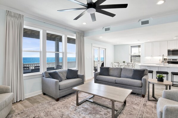 On the first floor, the living area—with oversized windows and uninterrupted beach views—flows seamlessly into the dining space and fully stocked kitchen, ideal for preparing and enjoying meals together when you're not exploring local restaurants. This level also includes two guest bedrooms and a full bathroom for added convenience, along with access to the porch where you can unwind to the soothing sound of the waves.