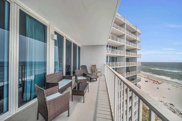 Step outside onto your private balcony, where the panoramic Gulf views will have you in full vacation mode. Lounge in the wicker chairs with your morning coffee or dine alfresco at the outdoor table for four while listening to the waves roll in.