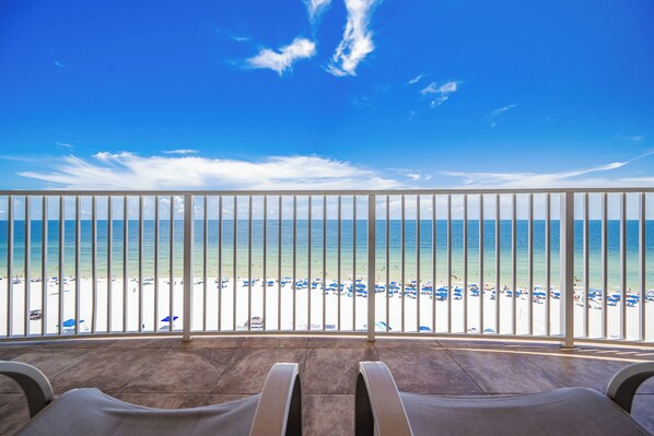 Entspannen Sie sich auf dem gefliesten 290 Quadratmeter großen Balkon am Strand mit einem Tisch und sechs Stühlen oder auf einem der beiden Liegestühle mit Blick auf die atemberaubenden weißen Strände und den Golf von Mexiko.