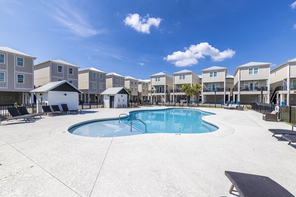 THE HOUSE -2023 construction -Steps away from the beach with a guest-only deeded beach access -Spacious floor plan, accommodates up to 10 guests -Private balcony overlooking the pool -3 bedrooms -4 full bathrooms -Community pool in front of the house -Dining space with table and bar seating -Smart TVs in each bedroom -WiFi boosters on each floor for excellent high speed internet -Full-sized washer and dryer -Dedicated parking spots under the house -Proximity to shopping, dining and beach activities -Ensuite bathrooms for each bedroom