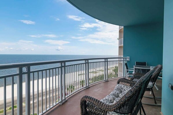 Enjoy picturesque views of the Gulf of Mexico from your private balcony on the 8th floor of Legacy Tower. This condo features comfortable couches and charming beach decor! You'll have a fully equipped kitchen with granite countertops and a breakfast bar, a standalone wet bar, plus a dishwasher, cooking appliances and coffee maker to make you feel at home. Practical amenities include an in-unit washer and dryer, private high-speed internet, and TVs in the living room and bedrooms.